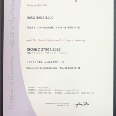株式会社RICE CLOUDは、このたびISMS(情報セキュリティマネジメントシステム)に関する国際規格「ISO/IEC 27001