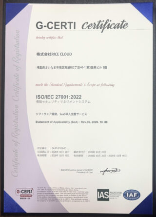 株式会社RICE CLOUDは、このたびISMS(情報セキュリティマネジメントシステム)に関する国際規格「ISO/IEC 27001:2022」の認証を取得しました。