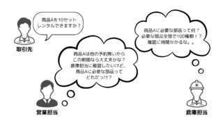 営業は商品単位で提案を行う一方で、倉庫では商品を構成する部品単位で在庫を管理していたため、必要な部品が全てそろっているかをすぐに判断できず、在庫状況を把握するのに時間がかかっていました。